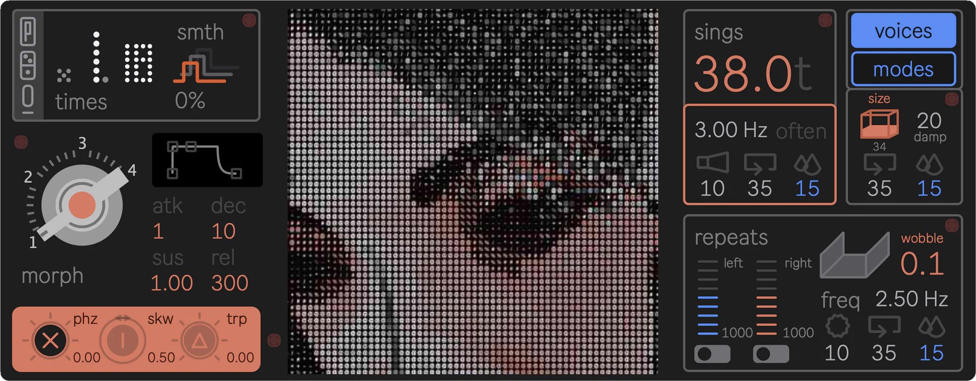 Repeats 模块内置立体声延迟/回声处理器,支持左右声道独立控制,并内置名为“wobble”的调制功能,可产生漂移效果。得益于 wobble 功能,你还能实现复古风格的回声效果。