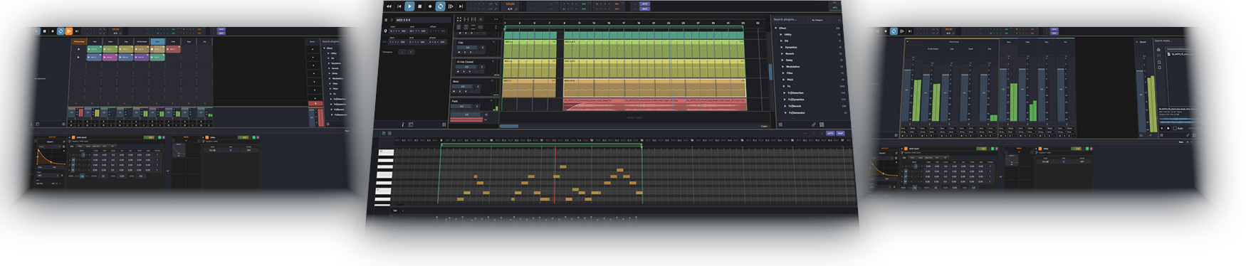 调制系统包含 16 个低频振荡器 (LFO) 和一个贝塞尔曲线编辑器,每个设备和机架提供 16 个宏旋钮。它还支持可嵌套的并行处理机架。钢琴卷帘窗上提供音高弯音和 MIDI CC 通道,并包含一个鼓组网格设备。混音器提供推子、声像、静音、独奏、发送和输入/输出路由功能。