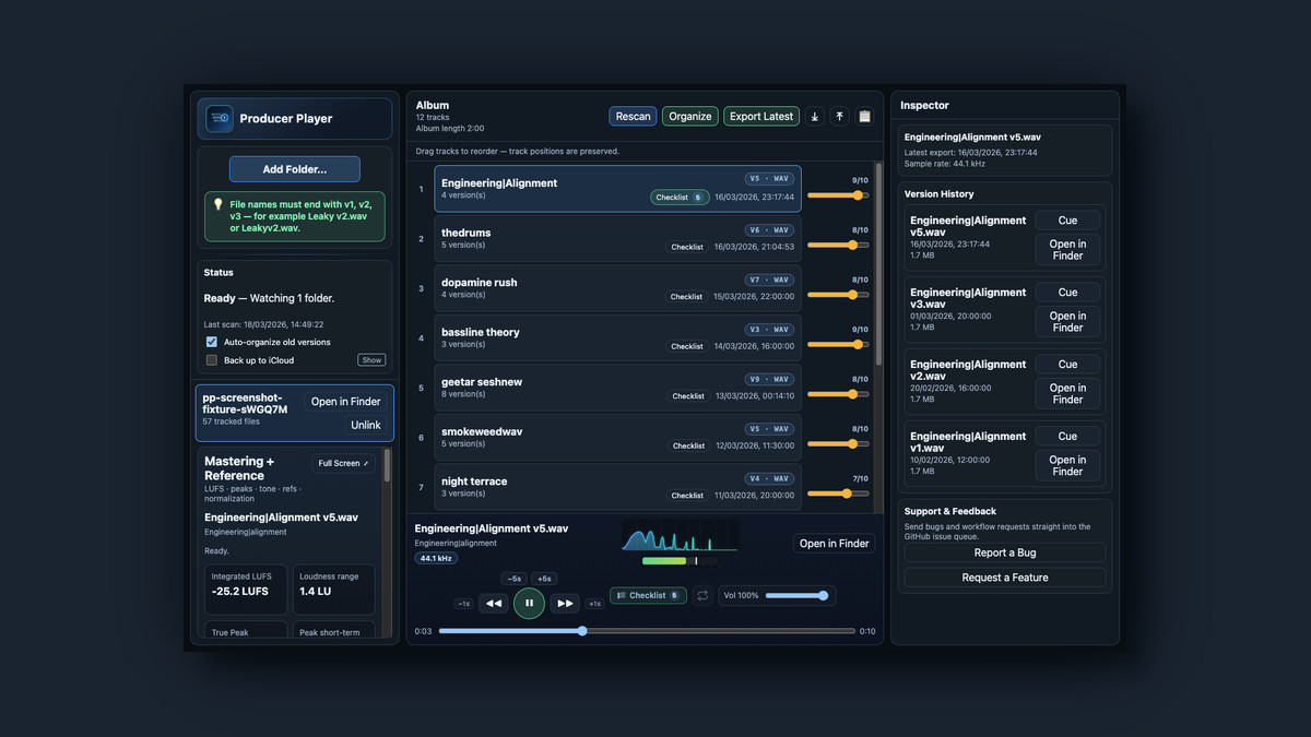 开发者 Ethan Sarif-Kattan(3000AD)将 Producer Player 描述为一款面向音乐制作人的免费开源应用,专为那些不断导出新混音文件、并希望在完成曲目制作的同时以更简洁的方式管理版本的制作人而设计。