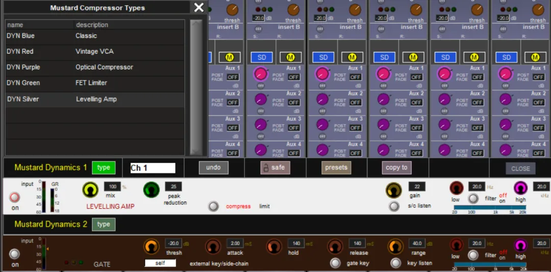 体验的差别,往往藏在细节里。V22版本中的多项工作流优化包括:在调音台应用内直接收集诊断文件;在立体声辅助通道之间复制辅助电平时,声像数据也将一并复制;当辅助节点设置为控制KLANG时,Aux发送位置将被隐藏,因KLANG无需此参数;Mustard动态压缩量(Mustard Dynamics Gain Reduction)与门限状态现可在通道总览中显示。