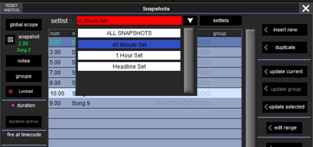 V22还在快照面板中加入了歌单(Setlist)功能。这一功能是用户呼声极高的需求,旨在通过快照库快速构建定制化演出。默认情况下,“所有快照”(All Snapshots)列表包含当前项目中的所有快照。用户可以创建更多歌单,并向其中添加或移除快照,调音台将仅调用当前歌单中的快照。歌单中的快照顺序可与“所有快照”列表不同,调音台将按自定义顺序依次触发。一个实际应用场景是:在音乐节期间,某支乐队每天的演出时长可能不同,音响工程师可以分别创建45分钟、1小时及压轴场的专属歌单,方便快速选择演出配置。