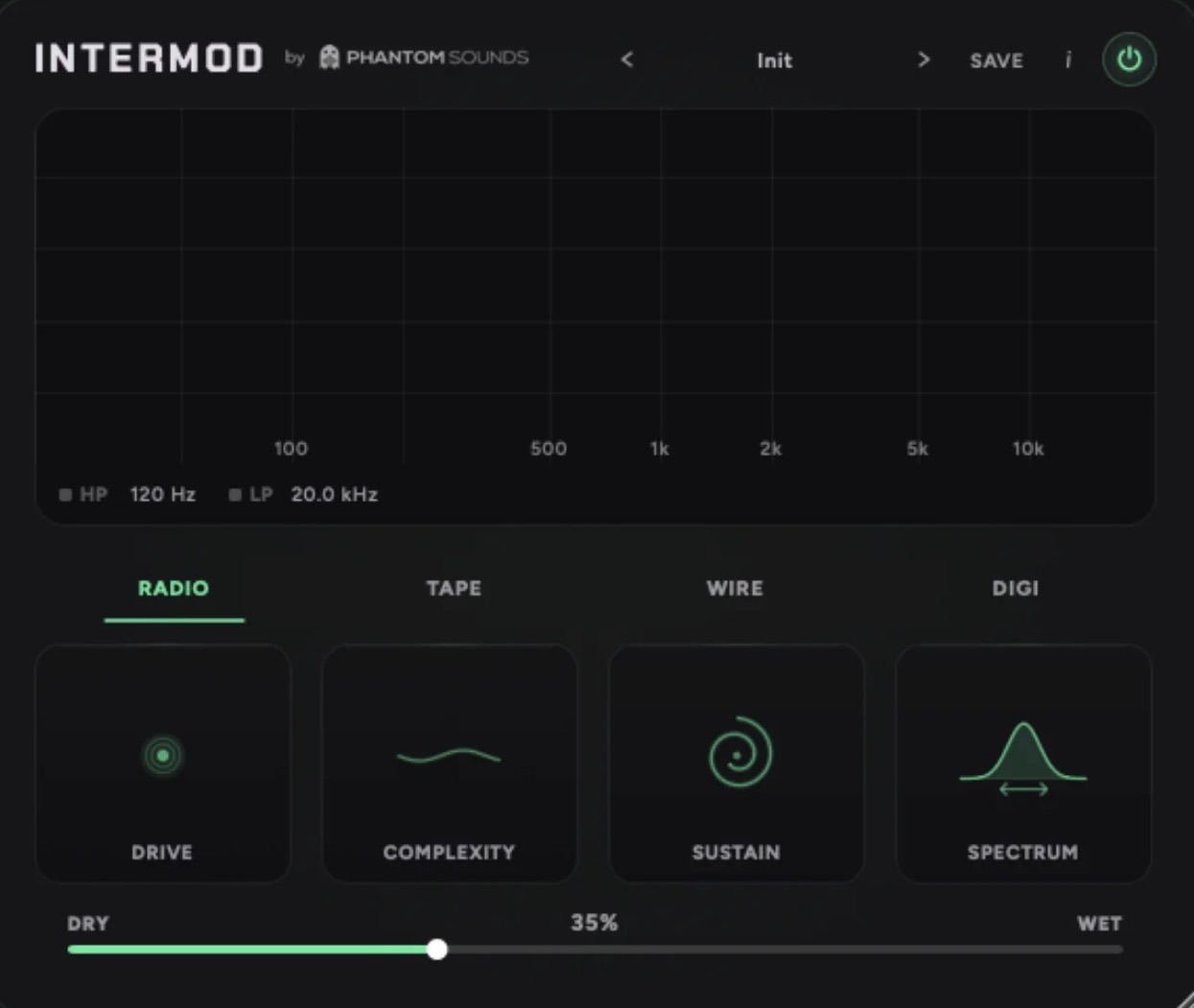 控制参数:包括 DRIVE(用于调整互调的频率数量)、COMPLEXITY(可设置为 5 阶)、SUSTAIN(用于调整频谱反馈)、SPECTRUM(用于调整低频和高频平衡)以及 MIX(用于调整干湿比)。